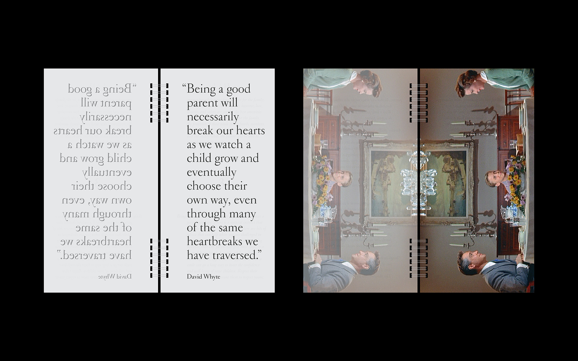 Children are reflections of their parents. This idea inspired a series of essays on good parenting, which were compiled into a booklet designed with decalcomania. Each page is mirrored on the neighboring page at half opacity, illustrating the concept that children inevitably absorb their parents’ behaviors and personalities.